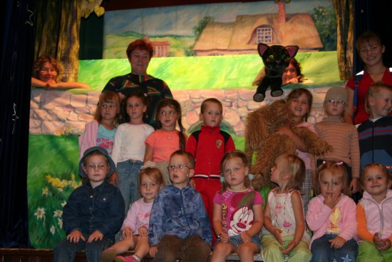Aktieri kopā ar lugas varoņiem un bērniem pēc ceļojošā leļļu teātra „Maska” izrādes „Es un Dievs – mēs esam draugi”. Foto: 2007. g.