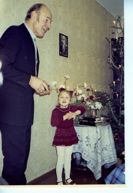 Mācītājs A. Beimanis ar mazu meitenīti savās mājās Ziemassvētku laikā. Foto: 1988. g.