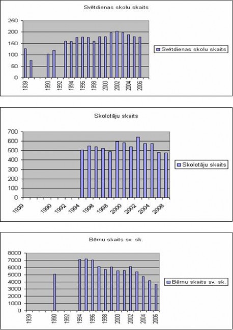 [9] Pievienoju Svētdienas skolu nozares darbinieku izveidotās diagrammas no papildinātajiem statistikas datiem. Izmantotie avoti: Baznīcas kalendārs 1939. – 56. lpp.; Veras Volgemutes raksts šajā grāmatā; Svētdienas Rīts. – 1990. – 18. oktobris, citēts šajā grāmatā; LELB draudžu atskaites. |